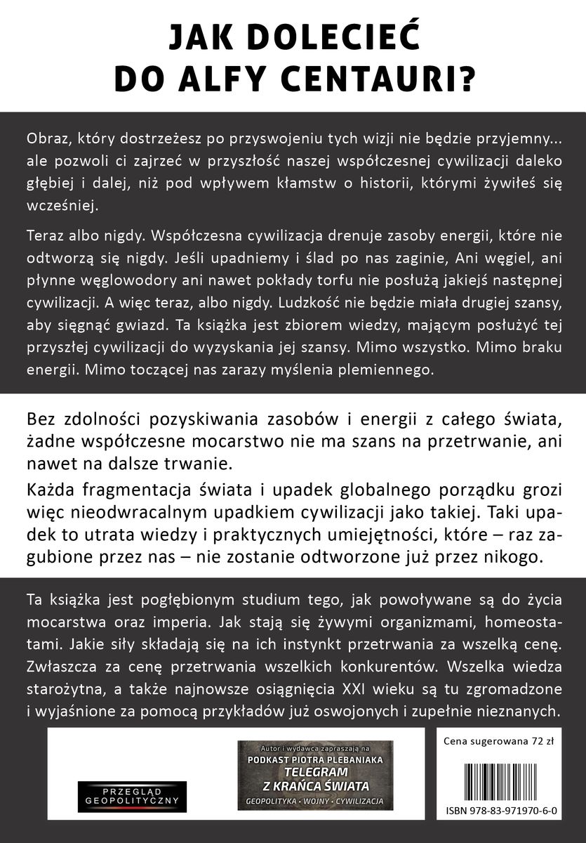 Czy ludzkości uda się dotrzeć do Alfy Centauri? Odpowiedź jest brutalna. Uda nam się teraz albo nigdy. Zrobimy to my, albo nie pojawi się już nikt, kto nam dorówna. Współczesna cywilizacja drenuje zasoby energii, które nie odtworzą się nigdy. Jeśli upadniemy i ślad po nas zaginie, Ani węgiel, ani płynne węglowodory, ani nawet pokłady torfu nie posłużą jakiejś następnej cywilizacji. A więc raz jeszcze: teraz, albo nigdy. Ludzkość nie będzie miała drugiej szansy, aby sięgnąć gwiazd. Ta książka jest zbiorem wiedzy, mającym posłużyć tej przyszłej cywilizacji do wyzyskania jej szansy. Mimo wszystko. Mimo braku energii. Mimo dewastacji kluczowych sił energetyzujących nas do budowy bezpiecznego świata dla przyszłych pokoleń.