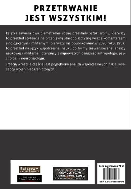 Co w  środku: Książka zawiera przekład traktatu z klasycznego języka chińskiego na stylizowaną staropolszczyznę... oraz przekład starożytnego dzieła na język współczesnej nauki: socjologii, antropologii i sztuki wojennej. Dodatkiem jest pogłębiona analiza współczesnego chińskiego dzieła pt. Wojna nieograniczona.