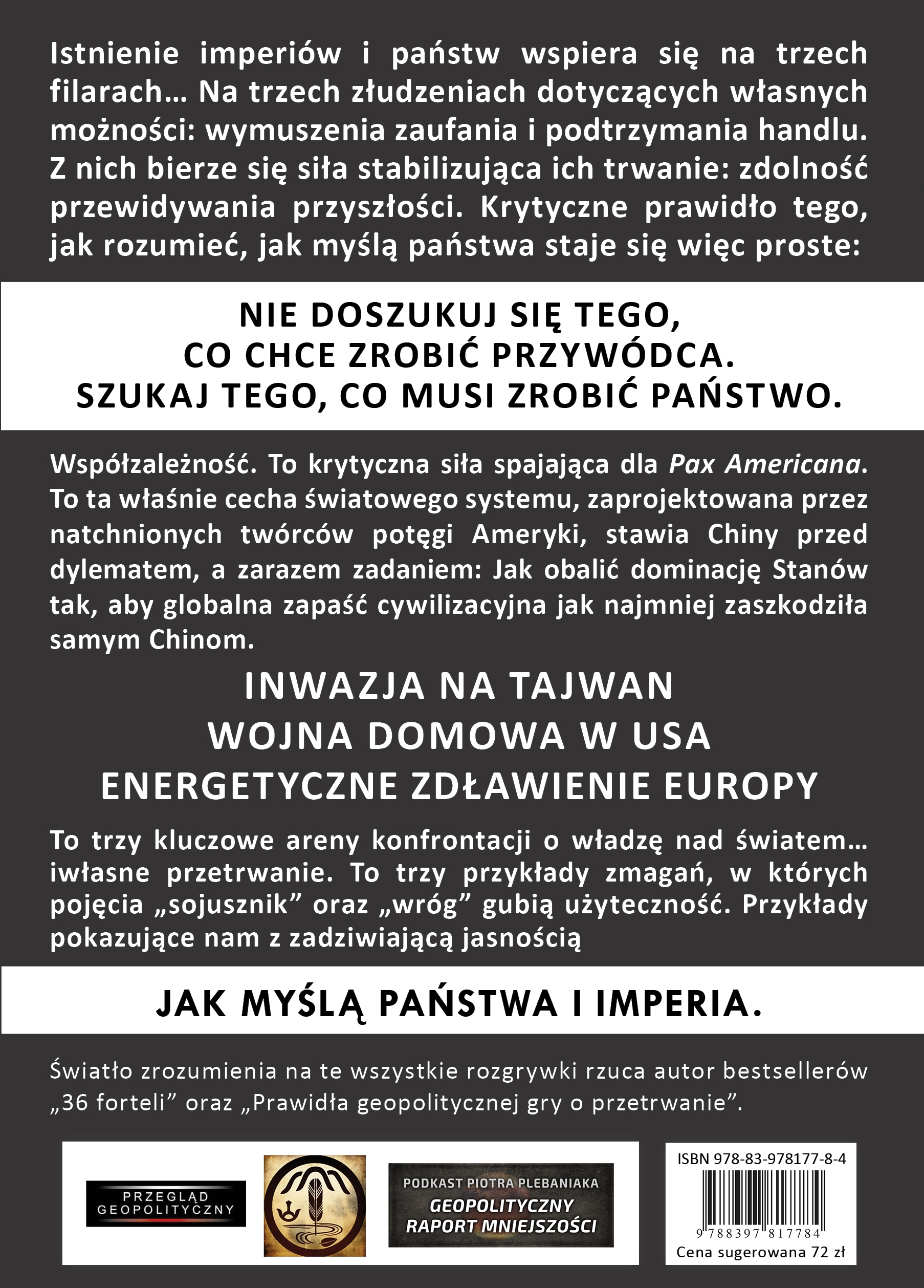 Współzależność. To krytyczna siła spajająca dla Pax Americana. To ta właśnie cecha światowego systemu, zaprojektowana przez natchnionych twórców potęgi Ameryki, stawia Chiny przed dylematem, a zarazem zadaniem: Jak obalić dominację Stanów tak, aby globalna zapaść cywilizacyjna jak najmniej zaszkodziła samym Chinom. Inwazja na Tajwan Wojna domowa w USA Energetyczne zdławienie Europy To trzy kluczowe areny konfrontacji o władzę nad światem… iwłasne przetrwanie. To trzy przykłady zmagań, w których pojęcia „sojusznik” oraz „wróg” gubią użyteczność. Przykłady pokazujące nam z zadziwiającą jasnością JAK MYŚLĄ PAŃSTWA I IMPERIA. Światło zrozumienia na te wszystkie rozgrywki rzuca autor bestsellerów „36 forteli” oraz „Prawidła geopolitycznej gry o przetrwanie”.