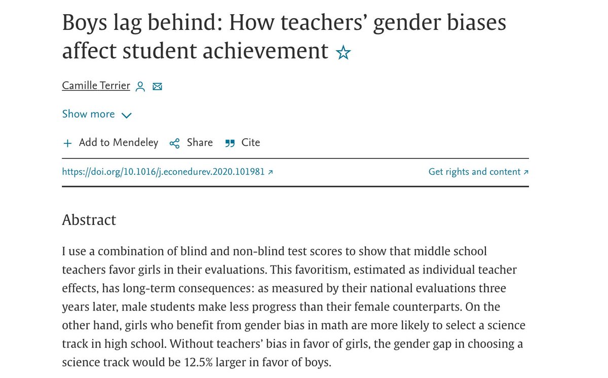 Badanie: dyskryminacja chłopców przez nauczycielki we Francji. Efekt: 12,5% mniej chłopców wybiera kierunki naukowe/matematyczne.